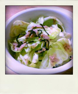 キャベツサラダは、キャベツ、ツナ、塩こんぶ、ごま油、すりごま。