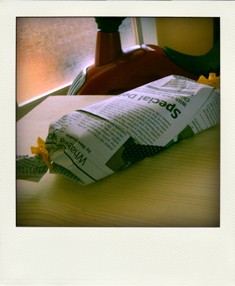写真はそのバナナケーキ。英字新聞をマステでとめてリボンで結んだよ。